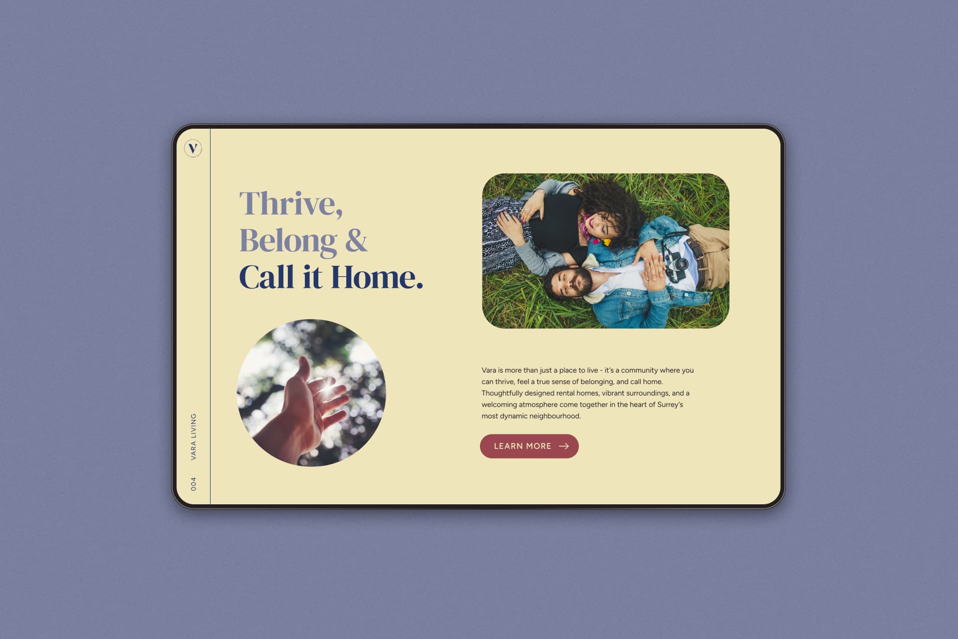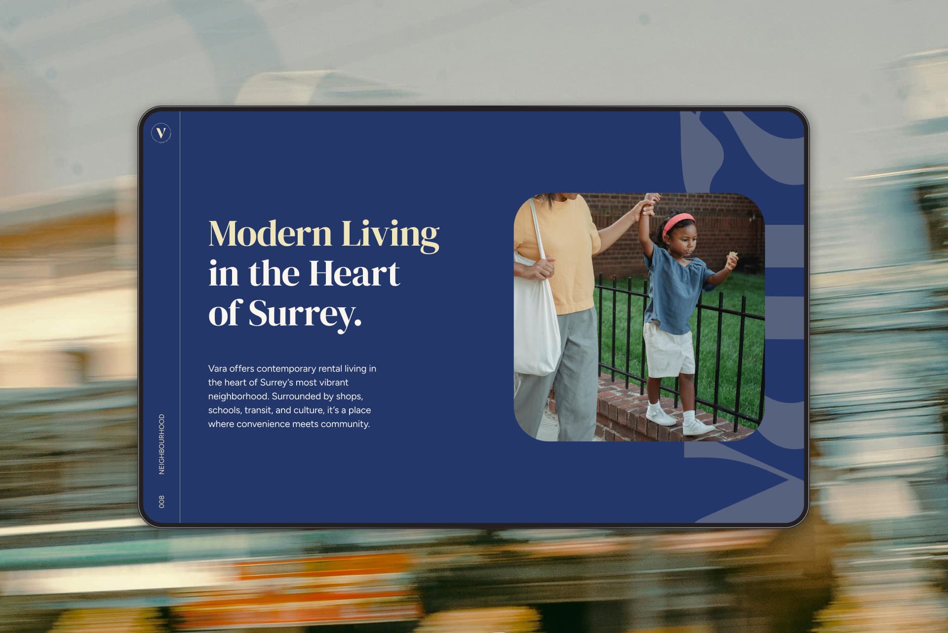 We developed the brand strategy for Vara by building on the existing name and vision, refining the brand’s positioning, personality, and voice. Our work focused on capturing the spirit of modern urban living in Surrey - highlighting community, culture, and connection through thoughtful messaging and brand tone.